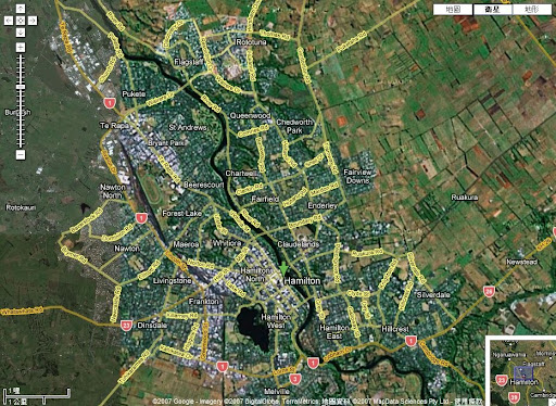 從奧克蘭沿SH 1往南走大概1.5 - 2個小時就可以到達Hamilton。從地圖可以看到,Hamilton比奧克蘭小上很多。Hamilton在懷卡托河的兩岸建城,河畔都不失為風景秀麗的地方。