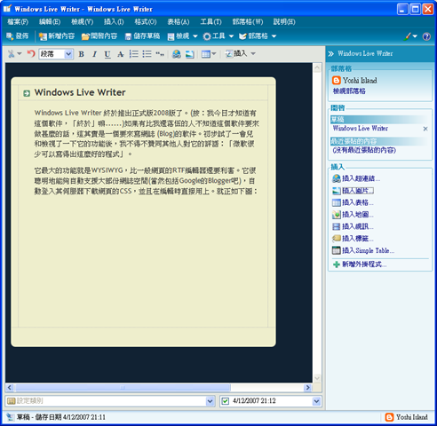 Windows Live Writer 終於推出正式版2008版了。(按:我今日才知道有這個軟件,「終於」嘛......)如果有比我還落伍的人不知道這個軟件要來做甚麼的話,這其實是一個要來寫網誌 (Blog)的軟件。初步試了一會兒和檢視了一下它的功能後,我不得不贊同其他人對它的評語:「微軟很少可以寫得出這麼好的程式」。